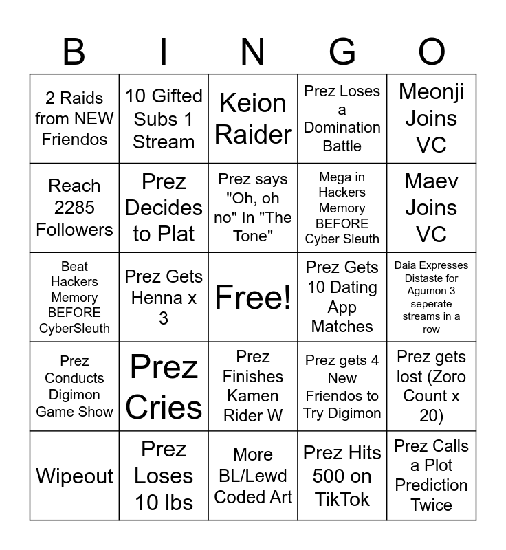 This bingo card has a free space and 24 words: Prez Cries, Prez Loses 10 lbs, Prez says "Oh, oh no" In "The Tone", Wipeout, Meonji Joins VC, 2 Raids from NEW Friendos, Reach 2285 Followers, 10 Gifted Subs 1 Stream, Prez Gets 10 Dating App Matches, Prez Finishes Kamen Rider W, Mega in Hackers Memory BEFORE Cyber Sleuth, Beat Hackers Memory BEFORE CyberSleuth, Prez gets 4 New Friendos to Try Digimon, Prez gets lost (Zoro Count x 20), Prez Decides to Plat, Prez Hits 500 on TikTok, Daia Expresses Distaste for Agumon 3 seperate streams in a row, Keion Raider, Maev Joins VC, Prez Gets Henna x 3, Prez Calls a Plot Prediction Twice, Prez Conducts Digimon Game Show, Prez Loses a Domination Battle and More BL/Lewd Coded Art.