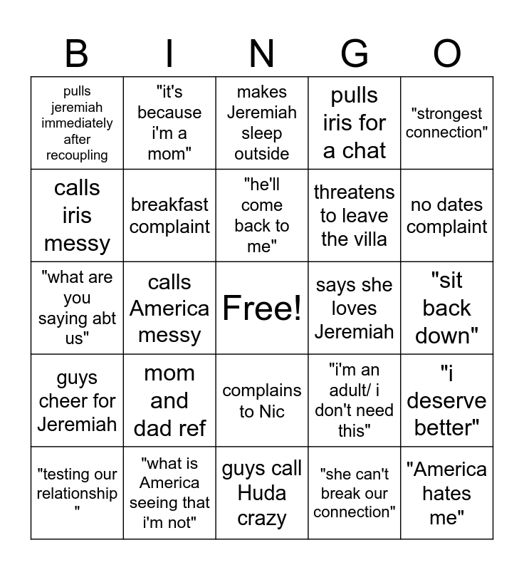 This bingo card has a free space and 24 words: mom and dad ref, "what is America seeing that i'm not", "he'll come back to me", "testing our relationship ", "strongest connection", pulls jeremiah immediately after recoupling, calls iris messy, "it's because i'm a mom", says she loves Jeremiah, complains to Nic, threatens to leave the villa, "what are you saying abt us", "i'm an adult/ i don't need this", "i deserve better", breakfast complaint, "she can't break our connection", "sit back down", makes Jeremiah sleep outside, no dates complaint, calls America messy, "America hates me", guys cheer for Jeremiah, pulls iris for a chat and guys call Huda crazy.