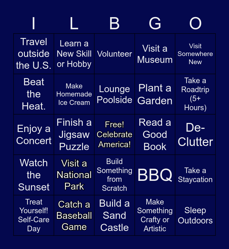 This bingo card has a free space and 24 words: Visit a National Park, Catch a Baseball Game, Lounge Poolside, Treat Yourself! Self-Care Day, Visit Somewhere New, Travel outside the U.S., Beat the Heat., Learn a New Skill or Hobby, Read a Good Book, Build Something from Scratch, Plant a Garden, Enjoy a Concert, BBQ, Take a Staycation, Make Homemade Ice Cream, Make Something Crafty or Artistic, De-Clutter, Volunteer, Take a Roadtrip (5+ Hours), Finish a Jigsaw Puzzle, Sleep Outdoors, Watch the Sunset, Visit a Museum and Build a Sand Castle.