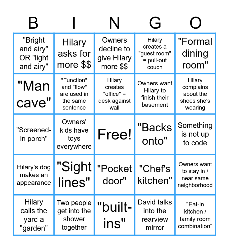 This bingo card has a free space and 68 words: "Jack and Jill", "Eat-in kitchen / family room combination", Love It list includes 3: expand, create, renovate, build, add, enlarge, "Walk-in closet", "Mudroom", Owners want to be close to downtown, Hilary asks for more $$, "2nd floor laundry", Hilary creates "office" = desk against wall, "Load-bearing", "Pocket door", David asks to expand the search area, Something is not up to code, "Formal dining room", David shows owners a house with a pool, "Man cave", Owners' kids have toys everywhere, "Bright and airy" OR "light and airy", Owners use bathtub for storage, "Sight lines", Owners want Hilary to finish their basement, "Chef's kitchen", Hilary's dog makes an appearance, "Turnkey", List It list includes 3: dedicated, designated, bonus, guest room, open concept, Contractor needs to consult with engineer, Hilary takes a bathroom off list, Hilary takes a guest room off list, Owners want to stay in / near same neighborhood, Owners give Hilary more $$, Owners decline to give Hilary more $$, "Steel beam", "Character", "Multi-purpose", Hilary creates a "guest room" = pull-out couch, "Natural light", Hilary says "gay-raj", Hilary calls the yard a "garden", Hilary complains about the shoes she's wearing, "Screened-in porch", "Re-jig", "Drop zone", "Function" and "flow" are used in the same sentence, "Main floor laundry", Hilary uses loud wallpaper, Owners want to get rid of fireplace, Owners want to keep fireplace, David shows a house on a busy road, "Backs onto", Two people get into the shower together, Hilary has "Love it" somewhere in reveal, "curb appeal", "front hall closet", "built-ins", Owners want a house with a pool, Owners have 2 kids sharing a room, David talks into the rearview mirror, "Wall to wall", "Top to bottom", Bowl of fruit in the reveal, "Powder room", "Wash room", "En suite", "Connection", "Modern", Crew demolishes perfectly good cupboards / counters, Owners want Hilary to add something to their list at the last minute and "Sitting area".