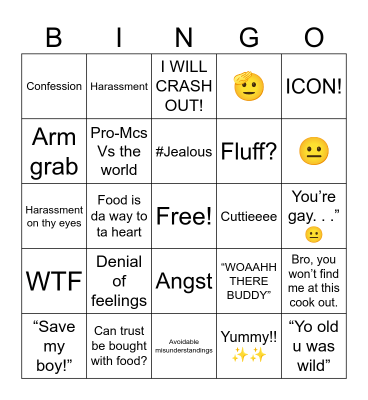 This bingo card has a free space and 25 words: Denial of feelings, Avoidable misunderstandings, #Jealous, “Save my boy!”, ICON!, Confession, Arm grab, Harassment, Cuttieeee, Angst, Fluff?, Harassment on thy eyes, “WOAAHH THERE BUDDY”, Bro, you won’t find me at this cook out., Pro-Mcs Vs the world, Low EQ, You’re gay. . .” 😐, I WILL CRASH OUT!, 😐, Food is da way to ta heart, “Yo old u was wild”, Can trust be bought with food?, WTF, 🫡 and Yummy!!✨✨.