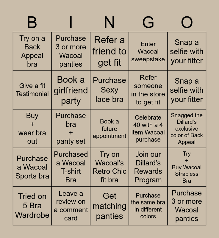 This bingo card has 25 words: Purchased a Wacoal T-shirt Bra, Get matching panties, Purchase Sexy lace bra, Tried on 5 Bra Wardrobe, Snap a selfie with your fitter, Try on a Back Appeal bra, Give a fit Testimonial, Purchase 3 or more Wacoal panties, Celebrate 40 with a 4 item Wacoal purchase, Try on Wacoal’s Retro Chic fit bra, Refer someone in the store to get fit, Buy + wear bra out, Join our Dillard’s Rewards Program, Try + Buy Wacoal Strapless Bra, Book a girlfriend party, Purchase 3 or more Wacoal panties, Snagged the Dillard’s exclusive color of Back Appeal, Refer a friend to get fit, Snap a selfie with your fitter, Purchase bra + panty set, Book a future appointment, Leave a review on a comment card, Purchase a Wacoal Sports bra, Enter Wacoal sweepstake and Purchase the same bra in different colors.