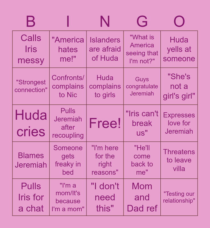This bingo card has a free space and 24 words: Pulls Iris for a chat, Someone gets freaky in bed, Huda complains to girls, Mom and Dad ref, Huda yells at someone, Calls Iris messy, "America hates me!", Islanders are afraid of Huda, "Iris can't break us", Expresses love for Jeremiah, Huda cries, Confronts/ complains to Nic, "He'll come back to me", Threatens to leave villa, "Strongest connection", "I'm a mom/It's because I'm a mom", "I don't need this", "What is America seeing that I'm not?", "She's not a girl's girl", Blames Jeremiah, Pulls Jeremiah after recoupling, "I'm here for the right reasons", Guys congratulate Jeremiah and "Testing our relationship".