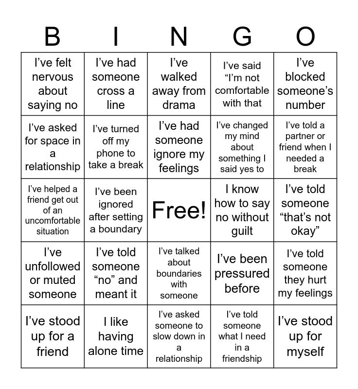 This bingo card has a free space and 24 words: I’ve told someone “no” and meant it, I like having alone time, I’ve had someone ignore my feelings, I’ve stood up for a friend, I’ve blocked someone’s number, I’ve felt nervous about saying no, I’ve asked for space in a relationship, I’ve had someone cross a line, I know how to say no without guilt, I’ve talked about boundaries with someone, I’ve changed my mind about something I said yes to, I’ve helped a friend get out of an uncomfortable situation, I’ve been pressured before, I’ve told someone they hurt my feelings, I’ve turned off my phone to take a break, I’ve told someone what I need in a friendship, I’ve told someone “that’s not okay”, I’ve walked away from drama, I’ve told a partner or friend when I needed a break, I’ve been ignored after setting a boundary, I’ve stood up for myself, I’ve unfollowed or muted someone, I’ve said “I’m not comfortable with that and I’ve asked someone to slow down in a relationship.