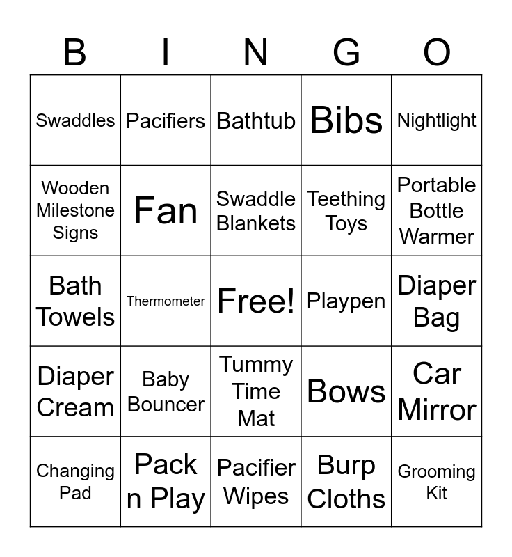 This bingo card has a free space and 32 words: Burp Cloths, Bottle Warmer, Thermometer, White Noise Machine, Diaper Cream, Fan, Nightlight, Car Mirror, Pacifiers, Diaper Pail, Swaddle Blankets, Bathtub, Sleep Sack, Boppy Pillow, Playpen, Bottles, Changing Pad, Bath Towels, Tummy Time Mat, Baby Bouncer, Bows, Diaper Caddy, Diaper Bag, Pack n Play, Grooming Kit, Bibs, Teething Toys, Wooden Milestone Signs, Swaddles, Pacifier Wipes, Vitamin D Drops and Portable Bottle Warmer.