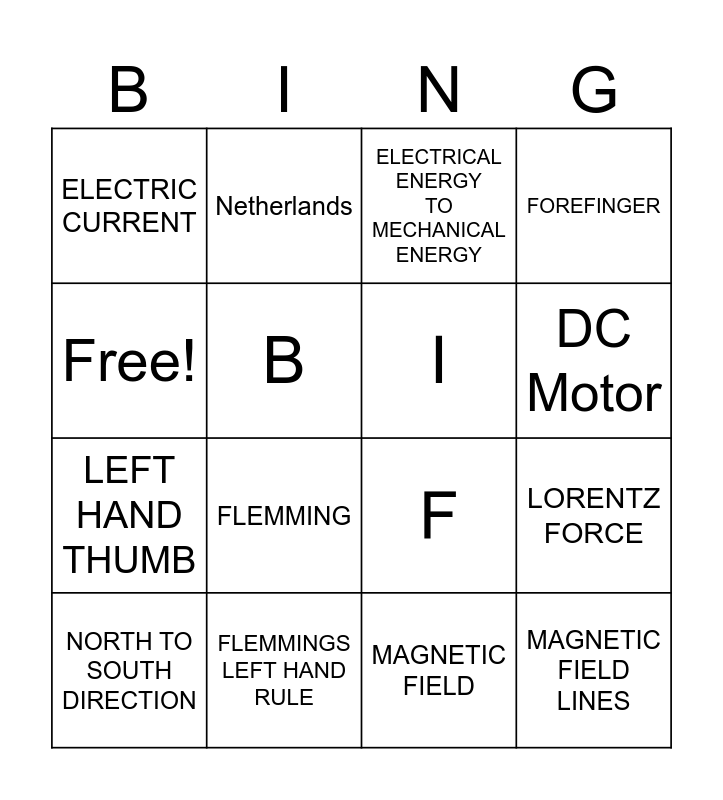 This bingo card has 16 words: FLEMMINGS LEFT HAND RULE, LORENTZ FORCE, ELECTRICAL ENERGY TO MECHANICAL ENERGY, ELECTRIC CURRENT, LEFT HAND THUMB, Netherlands, F, MAGNETIC FIELD, Free!, B, NORTH TO SOUTH DIRECTION, FOREFINGER, FLEMMING, DC Motor, I and MAGNETIC FIELD LINES.