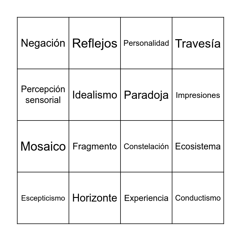 This bingo card has 16 words: Horizonte, Ecosistema, Personalidad, Negación, Mosaico, Reflejos, Constelación, Experiencia, Percepción sensorial, Idealismo, Escepticismo, Travesía, Fragmento, Impresiones, Paradoja and Conductismo.