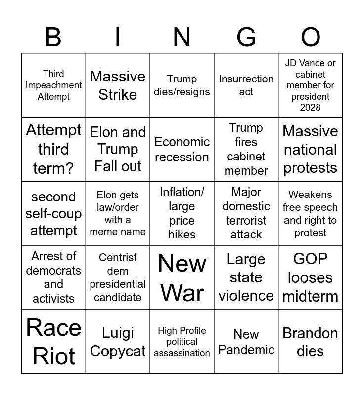 This bingo card has a free space and 24 words: Centrist dem presidential candidate, Luigi Copycat, Economic recession, Race Riot, JD Vance or cabinet member for president 2028, Third Impeachment Attempt, Attempt third term?, Massive Strike, Major domestic terrorist attack, New War, Trump fires cabinet member, second self-coup attempt, Large state violence, GOP looses midterm, Elon and Trump Fall out, New Pandemic, Weakens free speech and right to protest, Trump dies/resigns, Massive national protests, Elon gets law/order with a meme name, Brandon dies, Arrest of democrats and activists, Insurrection act and High Profile political assassination.