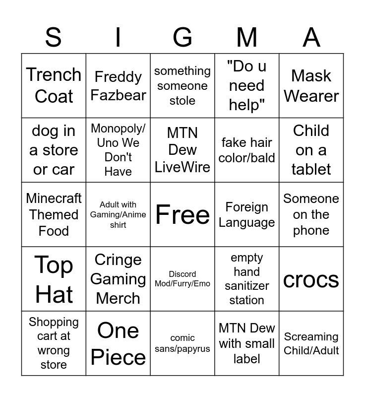 This bingo card has a free space and 41 words: Empty/Opened Drink, Minecraft Themed Food, Video Game Tie-In Beverage, Monopoly/ Uno We Don't Have, One Piece, Discord Mod/Furry/Emo, MTN Dew LiveWire, French Bulldog, Mask Wearer, Top Hat, Adult with Gaming/Anime shirt, "Do u need help", Screaming Child/Adult, Someone on the phone, Foreign Language, Cringe Gaming Merch, Sunglasses Indoors, Trench Coat, Walking while eating, something someone stole, crocs, live. laugh. love., comic sans/papyrus, fake hair color/bald, vandalism, someone's mom said no, MTN Dew with small label, Hatsune Miku, Child on a tablet, Homeless Dude, License plate from out of new england/northeast, Freddy Fazbear, Shopping cart at wrong store, someone's phone being loud, empty hand sanitizer station, dog in a store or car, mtn dew summer freeze, group of friends, rainbow friends, "sea food" in a store that it doesnt belong and anime sticker on a car.