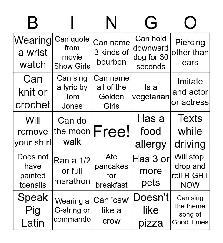 This bingo card has a free space and 24 words: Ran a 1/2 or full marathon, Wearing a G-string or commando, Can name all of the Golden Girls, Speak Pig Latin, Piercing other than ears, Wearing a wrist watch, Can knit or crochet, Can quote from movie Show Girls, Has a food allergy, Ate pancakes for breakfast, Is a vegetarian, Will remove your shirt, Has 3 or more pets, Will stop, drop and roll RIGHT NOW, Can sing a lyric by Tom Jones, Doesn't like pizza, Texts while driving, Can name 3 kinds of bourbon, Imitate and actor or actress, Can do the moon walk, Can sing the theme song of Good Times, Does not have painted toenails, Can hold downward dog for 30 seconds and Can 'caw' like a crow.