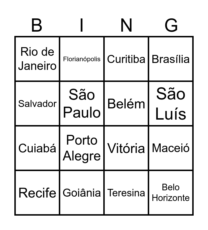 This bingo card has 16 words: Goiânia, Maceió, Curitiba, Rio de Janeiro, Cuiabá, Florianópolis, Vitória, Teresina, Salvador, São Paulo, Recife, Brasília, Porto Alegre, São Luís, Belém and Belo Horizonte.