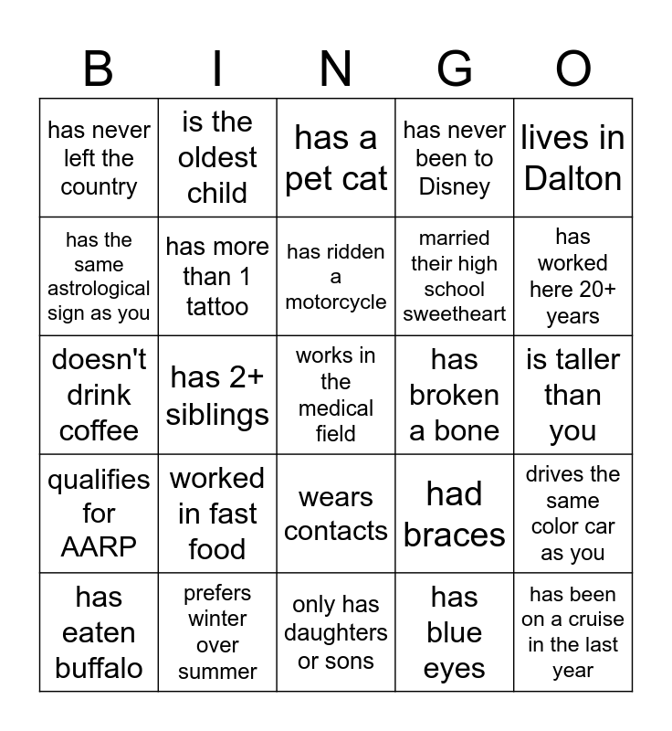 This bingo card has a free space and 24 words: worked in fast food, prefers winter over summer, has ridden a motorcycle, has eaten buffalo, lives in Dalton, has never left the country, has the same astrological sign as you, is the oldest child, has broken a bone, wears contacts, married their high school sweetheart, doesn't drink coffee, had braces, drives the same color car as you, has more than 1 tattoo, has blue eyes, is taller than you, has a pet cat, has worked here 20+ years, has 2+ siblings, has been on a cruise in the last year, qualifies for AARP, has never been to Disney and only has daughters or sons.