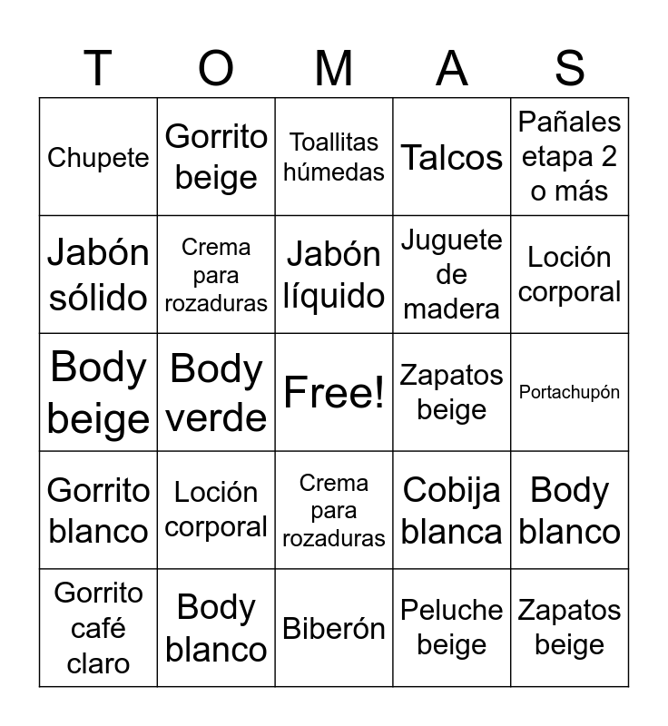 This bingo card has a free space and 50 words: Babero verde, Zapatos beige, Gorrito beige, Biberón, Loción corporal, Gorrito blanco, Gorrito beige, Cobija blanca, Jabón sólido, Pañales etapa 0 y 1, Crema para rozaduras, Talcos, Body blanco, Cobija blanca, Talcos, Cobija café claro, Jabón líquido, Zapatos beige, Babero verde, Pañales etapa 2 o más, Body verde, Peluche beige, Chupete, Juguete de madera, Toallitas húmedas, Zapatos beige, Loción corporal, Jabón líquido, Toallitas húmedas, Crema para rozaduras, Medias, Cobija beige, Zapatos blancos, Babero beige, Body blanco, Toalla para bebé, Babero blanco, Body blanco, Crema corporal, Portachupón, Body blanco, Pañales etapa 0 y 1, Gorrito beige, Medias, Gorrito café claro, Body beige, Zapatos blancos, Zapatos beige, Gorrito blanco and Peinilla para bebé.