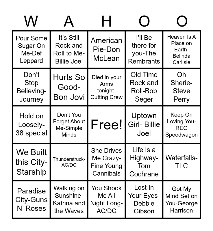 This bingo card has a free space and 75 words: 867-5309-Tommy Tutone, All that she wants- Ace of Base, American Pie-Don McLean, Another One Bites the Dust-Queen, Bad Case of Loving You-Robert Palmer, Blister in the sun- Violent Femmes, Born in the USA-Bruce Springsteen, Brown Eye Girl-Van Morrison, Centerfold- J Geils band, Centerfield-John Fogerty, Come on Eileen - Denys Midnight Runners, Dancing in the Dark- Bruce Springsteen, Died in your Arms tonight-Cutting Crew, Don’t Stop Believing-Journey, Don’t You Want Me- The Human League, Don’t You Forget About Me-Simple Minds, Free Fallin’-Tom Petty, Got My Mind Set on You-George Harrison, Hangin Tough-New Kids on the Block, Heaven Is A Place on Earth-Belinda Carlisle, Hit Me with your Best Shot-Pat Benatar, Hold on Loosely- 38 special, Hurts So Good-Bon Jovi, It’s Still Rock and Roll to Me- Billie Joel, I’ll Be there for you-The Rembrants, I love Rock N Roll-Joan Jett, I’m Gonna Be- The Proclaimers, I Think We’re Alone Now-Tiffany, I Wanna Dance with Somebody- Whitney Houston, Jack and Diane-John Mellencamp, Joy to the World-Three Dog Night, Jump Around- House of Pain, Karma Chameleon-Culture Club, Life is a Highway-Tom Cochrane, Oh Sherie-Steve Perry, Old Time Rock and Roll-Bob Seger, Jessie’s Girl-Rick Springfield, Keep Your hands to Yourself- The Georgia Satellites, Keep On Loving You-REO Speedwagon, Lost In Your Eyes-Debbie Gibson, Love Shack-The B52’s, Livin’ On A Prayer-Bon Jovi, Maneater-Daryl Hall, Mony Mony- Billy Idol, More than a Feeling- Boston, My Sharona-The Knack, Paradise City-Guns N’ Roses, Pour Some Sugar On Me-Def Leppard, Proud Mary-Creedence Clearwater Revival, Rich Girl- Daryl Hall and John Oates, Shout-Tears for Fears, She Drives Me Crazy- Fine Young Cannibals, The Safety Dance- Men Without Hats, Still of the Night- Whitesnake, Start Me- The Rolling Stones, Summer of ‘69-Bryan Adams, Sweet Child o’’ Mine-Guns N Roses, Tainted Love-Soft Cell, The Power of Love-Huey Lewis and The News, Take on Me-A-ha, Thunderstruck-AC/DC, T.N.T.-AC/DC, The Boys are Back in Town-Thin Lizzy, Total Eclipse of the Heart-Bonnie Tyler, Tubthumping-Chumbawamba, Uptown Girl- Billie Joel, Valerie-Amy Winehouse, We Didn’t Start the Fire-Billy Joel, What I Like About You-The Romantics, Waterfalls-TLC, We Built this City-Starship, Walking on Sunshine-Katrina and the Waves, You Give Love A Bad Name- Bon Jovi, You Shook Me All Night Long-AC/DC and Your love- the outfield.