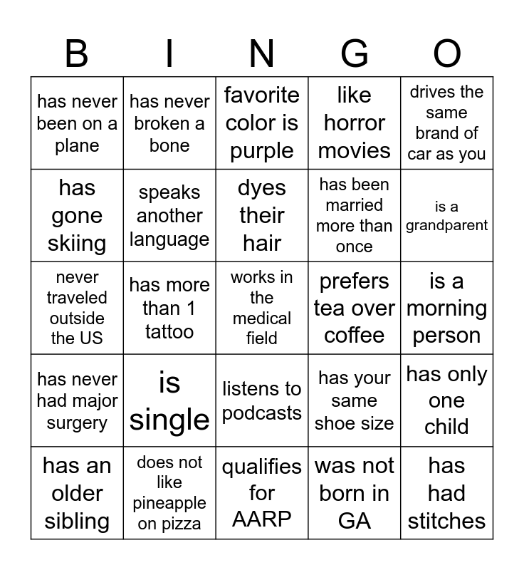 This bingo card has a free space and 24 words: is single, does not like pineapple on pizza, dyes their hair, has an older sibling, drives the same brand of car as you, has never been on a plane, has gone skiing, has never broken a bone, prefers tea over coffee, listens to podcasts, has been married more than once, never traveled outside the US, has your same shoe size, has only one child, speaks another language, was not born in GA, is a morning person, favorite color is purple, is a grandparent, has more than 1 tattoo, has had stitches, has never had major surgery, like horror movies and qualifies for AARP.