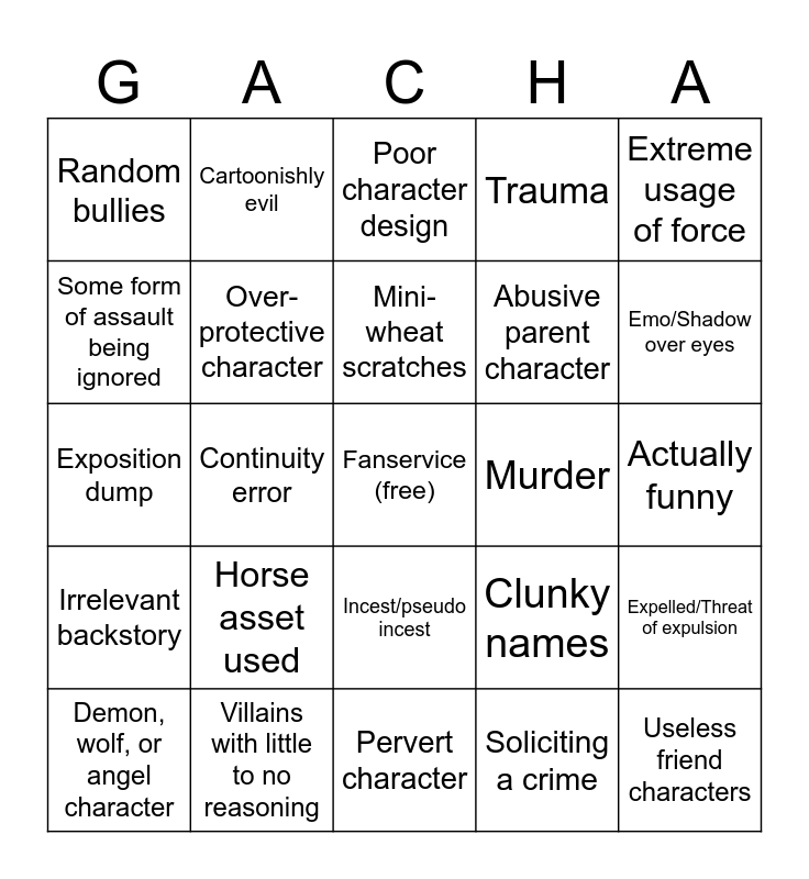 This bingo card has a free space and 59 words: Beach/ hotspring scene, Villains with little to no reasoning, Bad SFX, Irrelevant backstory, Soliciting a crime, Villain loses less villainous friend, Over-protective character, Pointless parent character, Abusive parent character, Parent picks a favorite, Trauma, Misspellings/grammatical errors, Some form of assault being ignored, Villains with basic names, Field trip, Random bullies, Useless friend characters, Extreme usage of force, Random power-up, Mini-wheat scratches, Murder, Poor character design, Demon, wolf, or angel character, Expelled/Threat of expulsion, Mean teacher/principal, Side quest, Problematic, 3D Model, Emo/Shadow over eyes, Marketplace, Rich, Random Teacher, Characters breaking background rules, Betrayal, Cartoonishly evil, Random pairing, Opening Music Plays, Continuity error, Protagonist clearly in the wrong, Exposition dump, Close up on eyes, Horse asset used, Actually funny, Discrimination, Bad joke, Weird lore, Off-model, Abusive relationship, Incest/pseudo incest, Pervert character, Nothing Burger, Flashback, Knight in shining armor, Animal buddy/familiar, Bad lip syncing, Clunky names, Yapping, So cool! and Phantom Thieves.