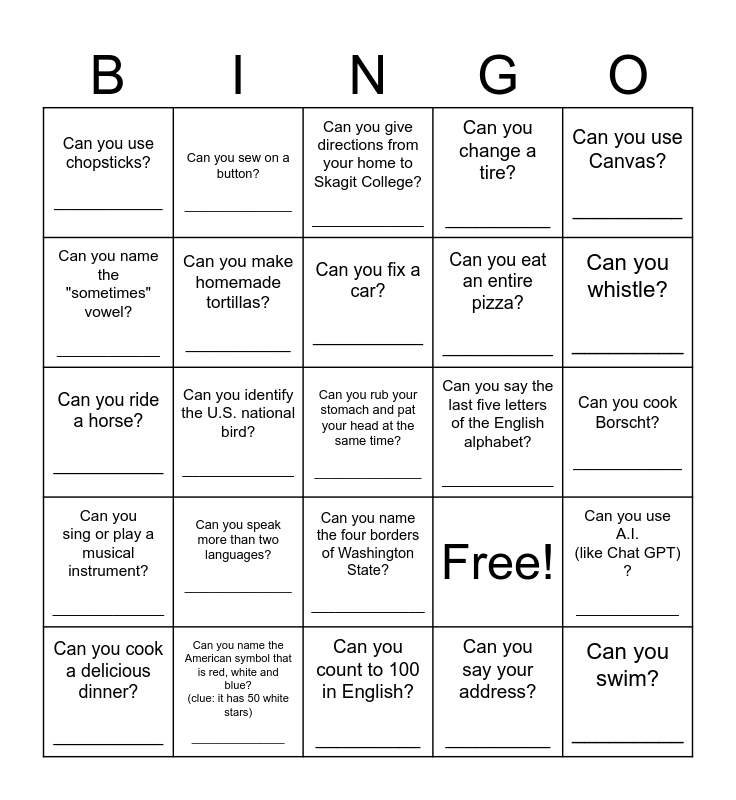 This bingo card has 25 words: Can you speak more than two languages? _______________, Can you count to 100 in English? __________, Can you fix a car? ___________, Can you cook a delicious dinner? ___________, Can you use Canvas? __________, Can you use chopsticks? ____________, Can you name the "sometimes" vowel? ____________, Can you sew on a button? _______________, Can you say the last five letters of the English alphabet? _____________, Can you name the four borders of Washington State? ______________, Can you eat an entire pizza? ___________, Can you ride a horse? ___________, Free!, Can you use A.I. (like Chat GPT) ? ____________, Can you make homemade tortillas? ___________, Can you swim? _________, Can you cook Borscht? ____________, Can you give directions from your home to Skagit College? _____________, Can you whistle? _________, Can you identify the U.S. national bird? _____________, Can you rub your stomach and pat your head at the same time? _______________, Can you name the American symbol that is red, white and blue? (clue: it has 50 white stars) _______________, Can you sing or play a musical instrument? _____________, Can you change a tire? __________ and Can you say your address? __________.
