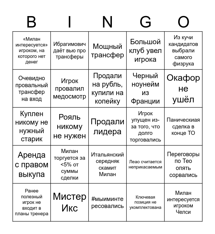 This bingo card has a free space and 24 words: Ранее полезный игрок не входит в планы тренера, Милан торгуется за <5% от суммы сделки, Продали на рубль, купили на копейку, Ключевая позиция не укомплектована, Из кучи кандидатов выбрали самого физрука, «Милан интересуется» игроком, на которого нет денег, Ибрагимович даёт вью про трансферы, Мощный трансфер, Игрок упущен из-за того, что долго торговались, Паническиая сделка в конце ТО, Куплен никому не нужный старик, Игрок провалил медосмотр, Леао считается неприкасаемым, Переговоры по Тео опять сорвались, Очевидно провальный трансфер на вход, Мистер Икс, #мыиминте ресовались, Большой клуб увел игрока, Окафор не ушёл, Аренда с правом выкупа, Рояль никому не нужен, Итальянский середняк скамит Милан, Черный ноунейм из Франции and Милан интересуется игроком Челси.
