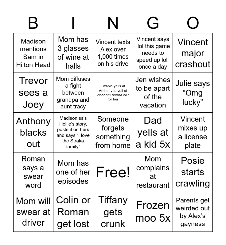 This bingo card has 26 words: Free!, Frozen moo 5x, Tiffanie yells at Anthony to yell at Vincent/Trevor/Colin for her, Colin or Roman get lost, Vincent major crashout, Madison mentions Sam in Hilton Head, Trevor sees a Joey, Mom has 3 glasses of wine at halls, Vincent mixes up a license plate, Mom complains at restaurant, Jen wishes to be apart of the vacation, Anthony blacks out, Posie starts crawling, Mom will swear at driver, Madison ss’s Hollie’s story, posts it on hers and says “I love the Straka family”, Someone gets too drunk and tells unknown family lore, Vincent says “lol this game needs to speed up lol” once a day, Roman says a swear word, Vincent texts Alex over 1,000 times on his drive, Someone forgets something from home, Julie says “Omg lucky”, Tiffany gets crunk, Dad yells at a kid 5x, Mom has one of her episodes, Mom diffuses a fight between grandpa and aunt tracy and Parents get weirded out by Alex’s gayness.