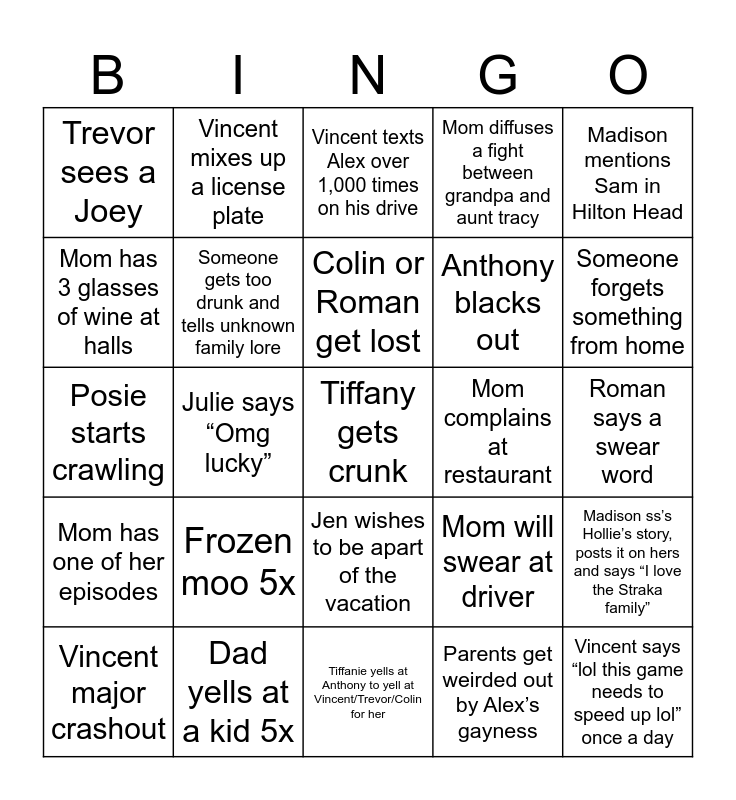This bingo card has 25 words: Frozen moo 5x, Tiffanie yells at Anthony to yell at Vincent/Trevor/Colin for her, Colin or Roman get lost, Vincent major crashout, Madison mentions Sam in Hilton Head, Trevor sees a Joey, Mom has 3 glasses of wine at halls, Vincent mixes up a license plate, Mom complains at restaurant, Jen wishes to be apart of the vacation, Anthony blacks out, Posie starts crawling, Mom will swear at driver, Madison ss’s Hollie’s story, posts it on hers and says “I love the Straka family”, Someone gets too drunk and tells unknown family lore, Vincent says “lol this game needs to speed up lol” once a day, Roman says a swear word, Vincent texts Alex over 1,000 times on his drive, Someone forgets something from home, Julie says “Omg lucky”, Tiffany gets crunk, Dad yells at a kid 5x, Mom has one of her episodes, Mom diffuses a fight between grandpa and aunt tracy and Parents get weirded out by Alex’s gayness.