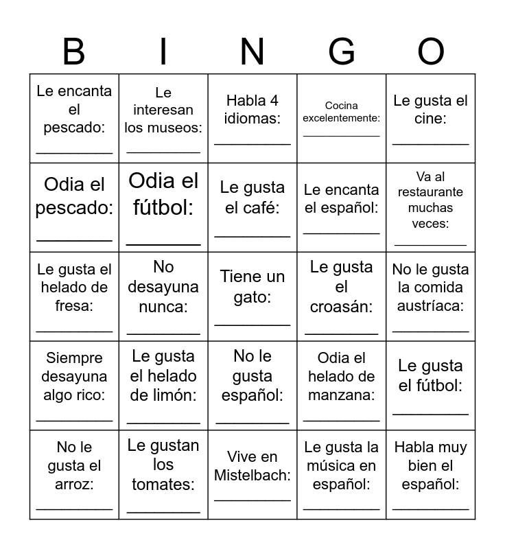 This bingo card has a free space and 24 words: Le gusta el helado de limón: ________, Le gustan los tomates: ________, Le gusta el café: ________, No le gusta el arroz: _________, Le gusta el cine: _________, Le encanta el pescado: _________, Odia el pescado: _______, Le interesan los museos: _________, Le gusta el croasán: ________, No le gusta español: ________, Le encanta el español: _________, Le gusta el helado de fresa: _________, Odia el helado de manzana: _________, Le gusta el fútbol: ________, Odia el fútbol: ______, Le gusta la música en español: _________, No le gusta la comida austríaca: _________, Habla 4 idiomas: _________, Va al restaurante muchas veces: __________, No desayuna nunca: ________, Habla muy bien el español: _________, Siempre desayuna algo rico: _________, Cocina excelentemente: _____________ and Vive en Mistelbach: _________.