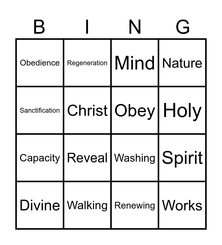 This bingo card has 16 words: Walking, Spirit, Mind, Obedience, Capacity, Regeneration, Washing, Renewing, Sanctification, Christ, Divine, Nature, Reveal, Holy, Obey and Works.