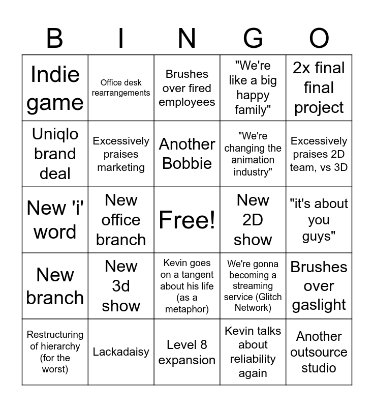 This bingo card has a free space and 24 words: New 3d show, Lackadaisy, Another Bobbie, Restructuring of hierarchy (for the worst), 2x final final project, Indie game, Uniqlo brand deal, Office desk rearrangements, New 2D show, Kevin goes on a tangent about his life (as a metaphor), "We're changing the animation industry", New 'i' word, We're gonna becoming a streaming service (Glitch Network), Brushes over gaslight, Excessively praises marketing, Kevin talks about reliability again, "it's about you guys", Brushes over fired employees, Excessively praises 2D team, vs 3D, New office branch, Another outsource studio, New branch, "We're like a big happy family" and Level 8 expansion.