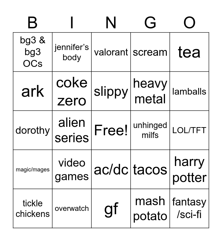 This bingo card has a free space and 24 words: video games, overwatch, slippy, tickle chickens, tea, bg3 & bg3 OCs, ark, jennifer’s body, unhinged milfs, ac/dc, heavy metal, dorothy, tacos, harry potter, coke zero, mash potato, LOL/TFT, valorant, lamballs, alien series, fantasy /sci-fi, magic/mages, scream and gf.