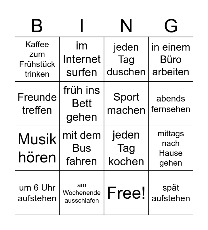 This bingo card has 17 words: Free!, um 6 Uhr aufstehen, jeden Tag duschen, Kaffee zum Frühstück trinken, mit dem Bus fahren, in einem Büro arbeiten, mittags nach Hause gehen, Sport machen, abends fernsehen, früh ins Bett gehen, am Wochenende ausschlafen, jeden Tag kochen, Freunde treffen, im Internet surfen, Musik hören, ein Buch lesen and spät aufstehen.