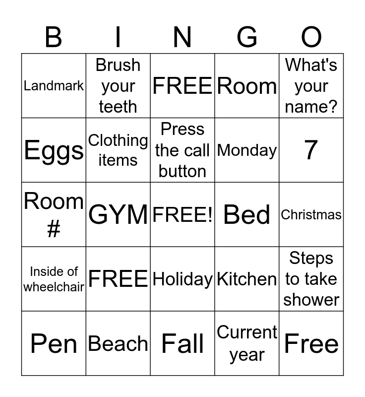 This bingo card has a free space and 24 words: FREE, Beach, Press the call button, Pen, What's your name?, Landmark, Eggs, Brush your teeth, Bed, Holiday, Monday, Room #, Kitchen, Steps to take shower, Clothing items, Current year, Christmas, FREE, 7, GYM, Free, Inside of wheelchair, Room and Fall.