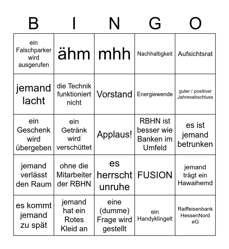 This bingo card has a free space and 24 words: ohne die Mitarbeiter der RBHN, jemand hat ein Rotes Kleid an, Vorstand, es kommt jemand zu spät, Aufsichtsrat, ein Falschparker wird ausgerufen, jemand lacht, ähm, RBHN ist besser wie Banken im Umfeld, es herrscht unruhe, Energiewende, ein Geschenk wird übergeben, FUSION, jemand trägt ein Hawaihemd, die Technik funktioniert nicht, ein Handyklingelt, es ist jemand betrunken, mhh, guter / positiver Jahresabschluss, ein Getränk wird verschüttet, Raiffeisenbank HessenNord eG, jemand verlässt den Raum, Nachhaltigkeit and eine (dumme) Frage wird gestellt.