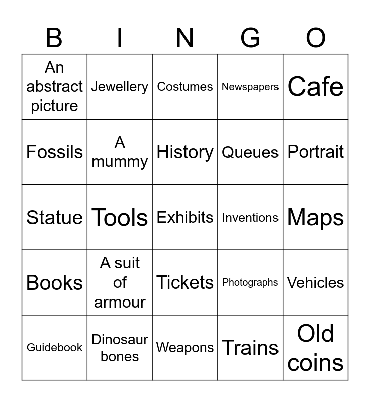 This bingo card has a free space and 29 words: Guidebook, A self portriat, Tools, A landscape, An abstract picture, Costumes, A mummy, A suit of armour, Inventions, Dinosaur bones, Maps, Old coins, Weapons, Trains, Portrait, Taxidermy, Tickets, Books, Cafe, Statue, Photographs, Planes, Queues, Fossils, Newspapers, Jewellery, Vehicles, History and Treasure.
