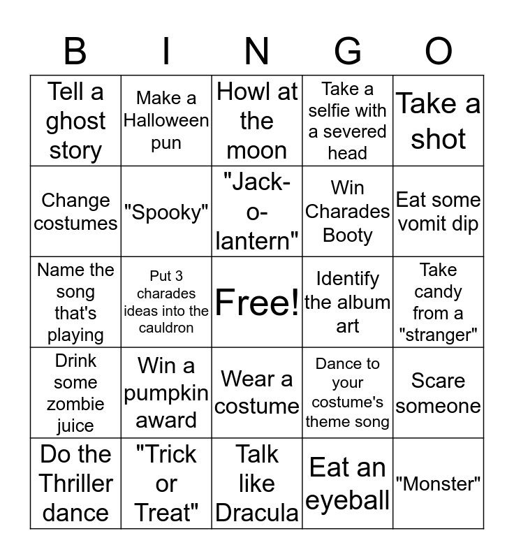 This bingo card has a free space and 24 words: Win a pumpkin award, "Trick or Treat", "Jack-o-lantern", Do the Thriller dance, Take a shot, Tell a ghost story, Change costumes, Make a Halloween pun, Identify the album art, Wear a costume, Win Charades Booty, Name the song that's playing, Dance to your costume's theme song, Scare someone, "Spooky", Eat an eyeball, Take candy from a "stranger", Howl at the moon, Eat some vomit dip, Put 3 charades ideas into the cauldron, "Monster", Drink some zombie juice, Take a selfie with a severed head and Talk like Dracula.