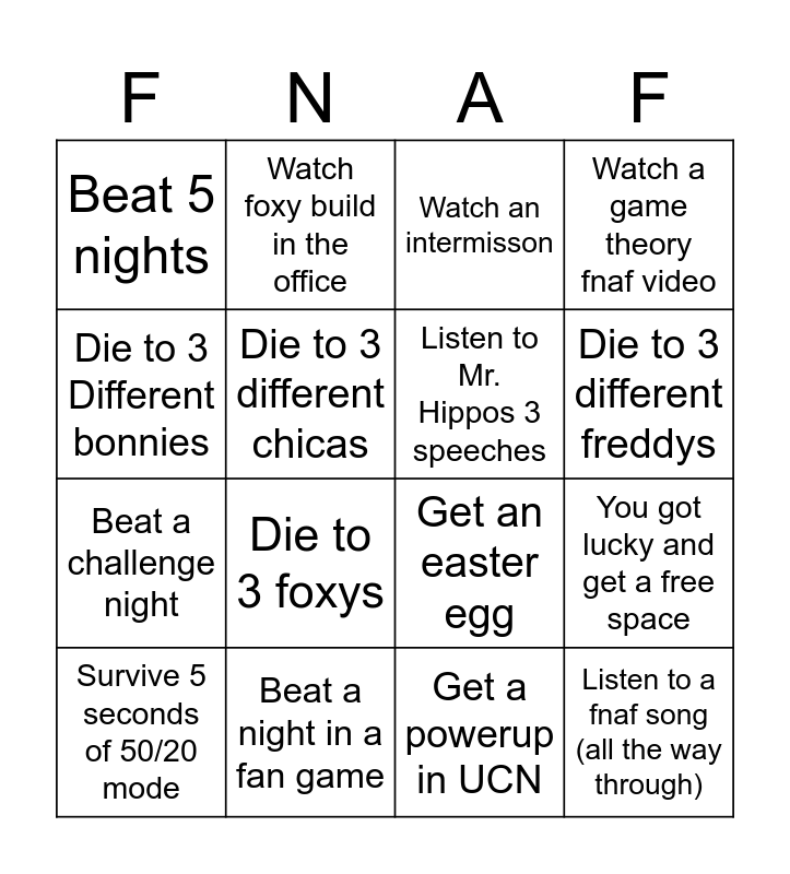 This bingo card has 24 words: Die to Mr. Hippo, Honk 3 freddy noses, Die to 3 different freddys, Run out of power, Die to 3 Different bonnies, Beat 5 nights, Die to 3 different chicas, Watch foxy build in the office, Beat a night in a fan game, Beat a custom night, Beat a challenge night, Get an easter egg, Activate DD, Die to music man, Listen to Mr. Hippos 3 speeches, Use a death coin, Get a powerup in UCN, Watch an intermisson, Die to 3 foxys, You got lucky and get a free space, Survive 5 seconds of 50/20 mode, Listen to a fnaf song (all the way through), Watch a game theory fnaf video and Read one page of a fanf fan fic.