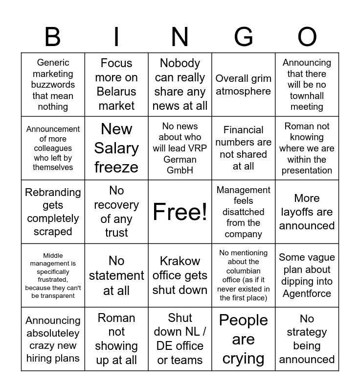 This bingo card has a free space and 24 words: No statement at all, Roman not showing up at all, No news about who will lead VRP German GmbH, Announcing absoluteley crazy new hiring plans, Announcing that there will be no townhall meeting, Generic marketing buzzwords that mean nothing, Announcement of more colleagues who left by themselves, Focus more on Belarus market, Management feels disattched from the company, Krakow office gets shut down, Financial numbers are not shared at all, Rebranding gets completely scraped, No mentioning about the columbian office (as if it never existed in the first place), Some vague plan about dipping into Agentforce, New Salary freeze, People are crying, More layoffs are announced, Nobody can really share any news at all, Roman not knowing where we are within the presentation, No recovery of any trust, No strategy being announced, Middle management is specifically frustrated, because they can't be transparent, Overall grim atmosphere and Shut down NL / DE office or teams.