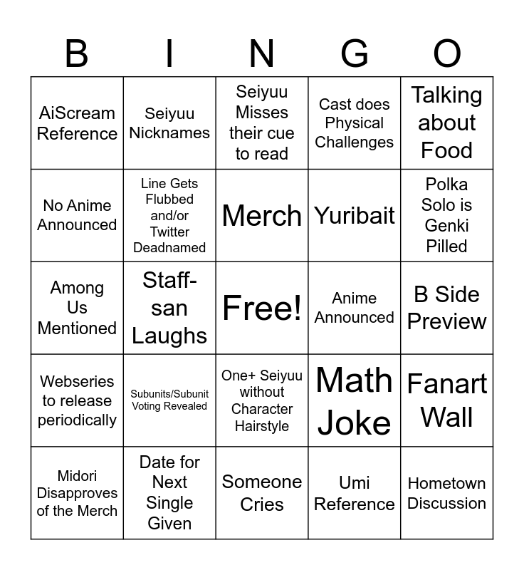 This bingo card has a free space and 24 words: Subunits/Subunit Voting Revealed, Date for Next Single Given, Merch, Midori Disapproves of the Merch, Talking about Food, AiScream Reference, No Anime Announced, Seiyuu Nicknames, Anime Announced, One+ Seiyuu without Character Hairstyle, Yuribait, Among Us Mentioned, Math Joke, Fanart Wall, Line Gets Flubbed and/or Twitter Deadnamed, Umi Reference, B Side Preview, Seiyuu Misses their cue to read, Polka Solo is Genki Pilled, Staff-san Laughs, Hometown Discussion, Webseries to release periodically, Cast does Physical Challenges and Someone Cries.