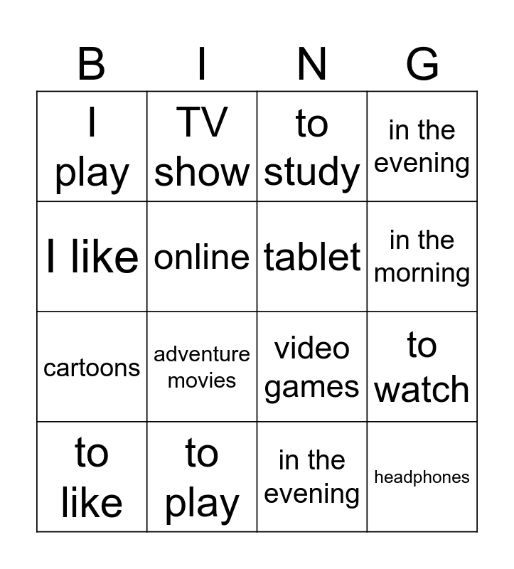 This bingo card has 20 words: to watch, I watch, to study, I study, to like, I like, to play, I play, cartoons, TV show, adventure movies, video games, online, headphones, tablet, videos, in the morning, in the evening, in the evening and at night.