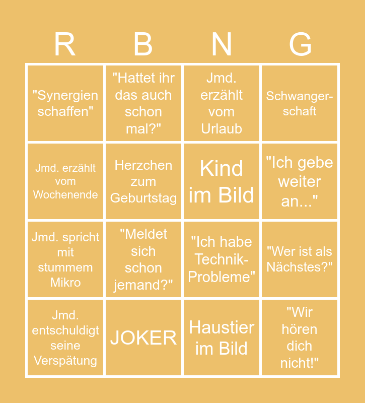 This bingo card has 28 words: "Ich eröffne damit die Runde", "Bei mir ist das Wetter...", Jmd. spricht mit stummem Mikro, "Das war mal eine schnelle Runde", Herzchen zum Geburtstag, Jmd. erzählt vom Urlaub, "Hattet ihr das auch schon mal?", "Wir hören dich nicht!", JOKER, "Ich möchte sensibili- sieren", "Ich habe Technik- Probleme", Schwanger- schaft, Kamera aus beim Herzchen- machen, "Das war der schnellste Sitzpunkt aller Zeiten!", "Meldet sich schon jemand?", Jmd. startet den Termin >5 Minuten früher, "Habt ihr das auch, dass...?", Kind im Bild, "Ich gebe weiter an...", Jmd. isst was, "Synergien schaffen", "Kann mich jemand dazuholen?", Jmd. entschuldigt seine Verspätung, "Wer ist als Nächstes?", Haustier im Bild, "Seht ihr schon was?", Jmd. erzählt vom Wochenende and "Muss leider los".