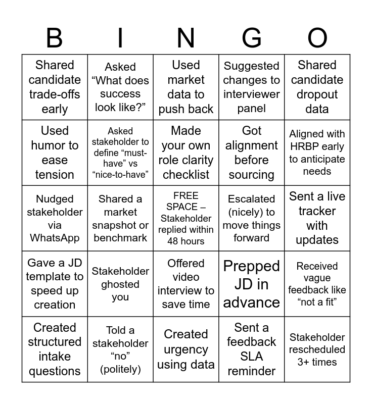 This bingo card has a free space and 24 words: Stakeholder ghosted you, Told a stakeholder “no” (politely), Made your own role clarity checklist, Created structured intake questions, Shared candidate dropout data, Shared candidate trade-offs early, Used humor to ease tension, Asked “What does success look like?”, Escalated (nicely) to move things forward, Offered video interview to save time, Got alignment before sourcing, Nudged stakeholder via WhatsApp, Prepped JD in advance, Received vague feedback like “not a fit”, Asked stakeholder to define “must-have” vs “nice-to-have”, Sent a feedback SLA reminder, Sent a live tracker with updates, Used market data to push back, Aligned with HRBP early to anticipate needs, Shared a market snapshot or benchmark, Stakeholder rescheduled 3+ times, Gave a JD template to speed up creation, Suggested changes to interviewer panel and Created urgency using data.