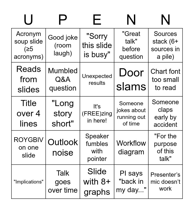 This bingo card has a free space and 30 words: Talk goes over time, "Preliminary data", "Long story short", "These findings were surprising...", Acronym soup slide (≥5 acronyms), "Sorry this slide is busy", Mumbled Q&A question, Speaker fumbles with pointer, Someone jokes about running out of time, Slide with 8+ graphs, Someone claps early by accident, Presenter’s mic doesn’t work, PI says "back in my day...", "We’re still optimizing this assay", Chart font too small to read, "We’re excited to share this today", Workflow diagram, ROYGBIV on one slide, Outlook noise, Sources stack (6+ sources in a pile), Title over 4 lines, One person asks 3+ questions, Good joke (room laugh), Door slams, Reads from slides, "Great talk" before question, "For the purpose of this talk", "Implications", Unexpected results and "This is more of a comment than a question".