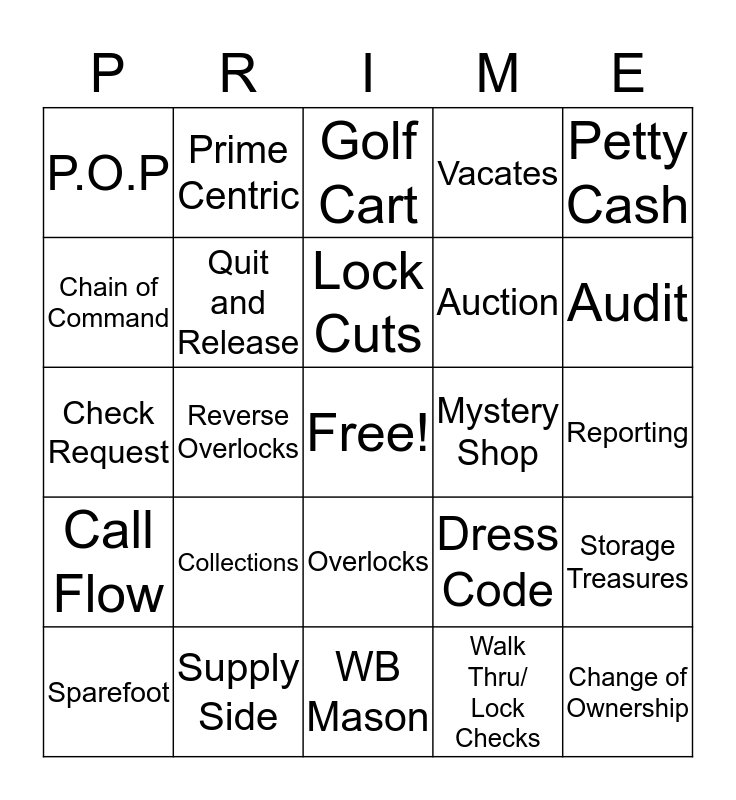 This bingo card has a free space and 24 words: Collections, Supply Side, Lock Cuts, Sparefoot, Petty Cash, P.O.P, Chain of Command, Prime Centric, Mystery Shop, Overlocks, Auction, Check Request, Dress Code, Storage Treasures, Quit and Release, Walk Thru/ Lock Checks, Reporting, Golf Cart, Audit, Reverse Overlocks, Change of Ownership, Call Flow, Vacates and WB Mason.