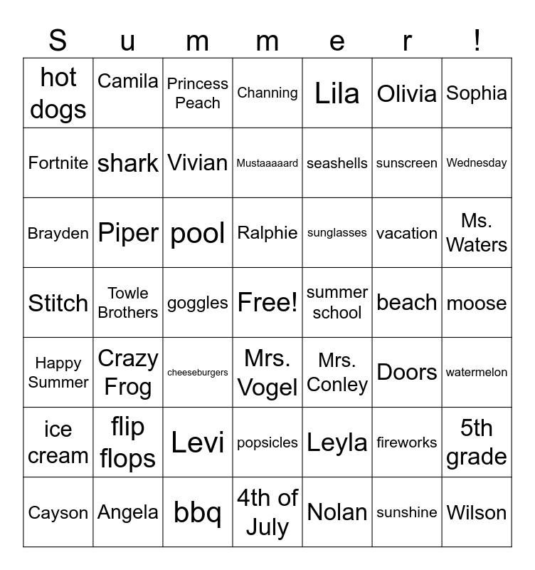 This bingo card has a free space and 48 words: Leyla, sunscreen, 4th of July, Towle Brothers, pool, moose, Camila, Angela, Olivia, Mrs. Vogel, Sophia, Channing, vacation, sunglasses, ice cream, beach, Fortnite, Wednesday, fireworks, Lila, seashells, goggles, hot dogs, shark, 5th grade, Vivian, Ms. Waters, Cayson, Ralphie, Piper, sunshine, summer school, watermelon, flip flops, Stitch, Mrs. Conley, Doors, Brayden, cheeseburgers, Levi, Happy Summer, Wilson, Princess Peach, bbq, Mustaaaaard, popsicles, Crazy Frog and Nolan.