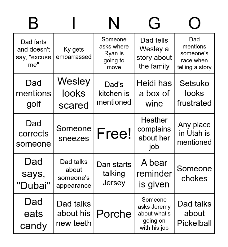 This bingo card has a free space and 24 words: Dad talks about someone's appearance, Dad talks about his new teeth, Dad's kitchen is mentioned, Dad eats candy, Dad mentions someone's race when telling a story, Dad farts and doesn't say, "excuse me", Dad mentions golf, Ky gets embarrassed, Heather complains about her job, Dan starts talking Jersey, Heidi has a box of wine, Dad corrects someone, A bear reminder is given, Someone chokes, Wesley looks scared, Someone asks Jeremy about what's going on with his job, Any place in Utah is mentioned, Someone asks where Ryan is going to move, Setsuko looks frustrated, Someone sneezes, Dad talks about Pickelball, Dad says, "Dubai", Dad tells Wesley a story about the family and Porche.