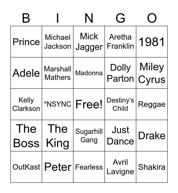 This bingo card has a free space and 24 words: The King, Peter, Madonna, OutKast, 1981, Prince, Adele, Michael Jackson, Destiny’s Child, Sugarhill Gang, Dolly Parton, Kelly Clarkson, Just Dance, Drake, Marshall Mathers, Avril Lavigne, Reggae, Mick Jagger, Miley Cyrus, *NSYNC, Shakira, The Boss, Aretha Franklin and Fearless.