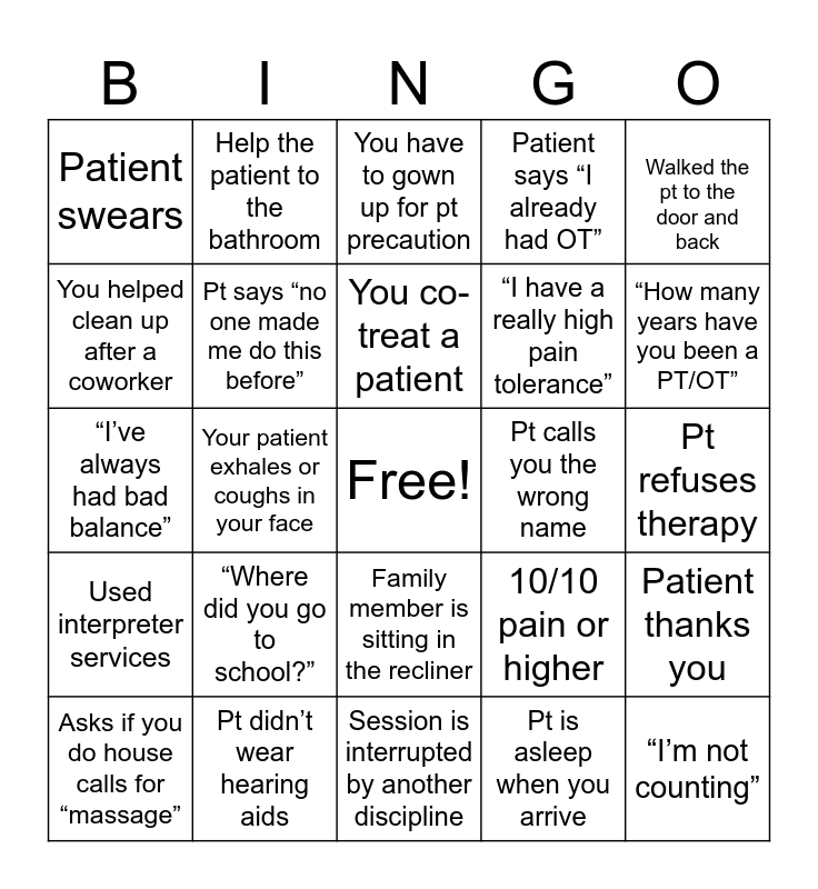 This bingo card has a free space and 24 words: “Where did you go to school?”, Pt didn’t wear hearing aids, You co-treat a patient, Asks if you do house calls for “massage”, Walked the pt to the door and back, Patient swears, You helped clean up after a coworker, Help the patient to the bathroom, Pt calls you the wrong name, Family member is sitting in the recliner, “I have a really high pain tolerance”, “I’ve always had bad balance”, 10/10 pain or higher, Patient thanks you, Pt says “no one made me do this before”, Pt is asleep when you arrive, Pt refuses therapy, You have to gown up for pt precaution, “How many years have you been a PT/OT”, Your patient exhales or coughs in your face, “I’m not counting”, Used interpreter services, Patient says “I already had OT” and Session is interrupted by another discipline.