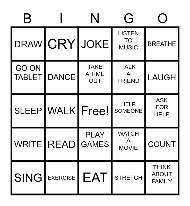 This bingo card has a free space and 24 words: READ, EXERCISE, TAKE A TIME OUT, SING, BREATHE, DRAW, GO ON TABLET, CRY, HELP SOMEONE, PLAY GAMES, TALK A FRIEND, SLEEP, WATCH A MOVIE, COUNT, DANCE, STRETCH, ASK FOR HELP, JOKE, LAUGH, WALK, THINK ABOUT FAMILY, WRITE, LISTEN TO MUSIC and EAT.