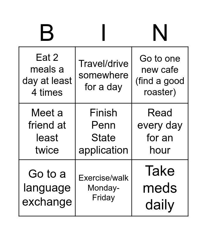 This bingo card has a free space and 8 words: Read every day for an hour, Go to one new cafe (find a good roaster), Travel/drive somewhere for a day, Go to a language exchange, Eat 2 meals a day at least 4 times, Take meds daily, Meet a friend at least twice and Exercise/walk Monday-Friday.