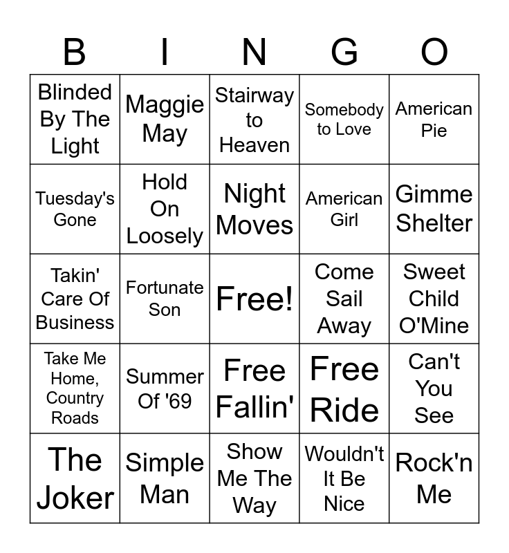This bingo card has a free space and 36 words: Take It Easy, Cocaine, Brandy (You're a Fine Girl), Hold On Loosely, Free Ride, Take Me Home, Country Roads, Night Moves, Brown Eyed Girl, American Pie, Jack & Diane, Fortunate Son, Somebody to Love, Peace of Mind, Come Sail Away, Gimme Shelter, Blinded By The Light, Only the Good Die Young, Summer Of '69, Rock'n Me, Stairway to Heaven, Sweet Child O'Mine, Can't You See, Simple Man, The Joker, Show Me The Way, Maggie May, Takin' Care Of Business, Old Time Rock & Roll, American Girl, Tuesday's Gone, Carry On Wayward Son, Nothin' But A Good Time, Wouldn't It Be Nice, Free Fallin', Ramblin' Man and Kickstart My Heart.