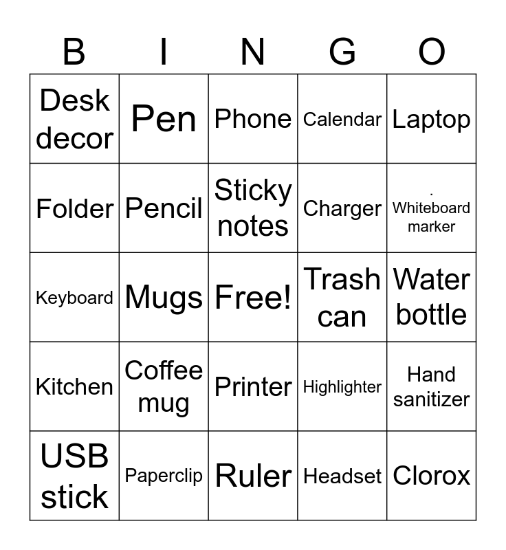 This bingo card has a free space and 24 words: Coffee mug, Paperclip, Sticky notes, USB stick, Laptop, Desk decor, Folder, Pen, Trash can, Printer, Charger, Keyboard, Highlighter, Hand sanitizer, Pencil, Headset, Water bottle, Phone, . Whiteboard marker, Mugs, Clorox, Kitchen, Calendar and Ruler.