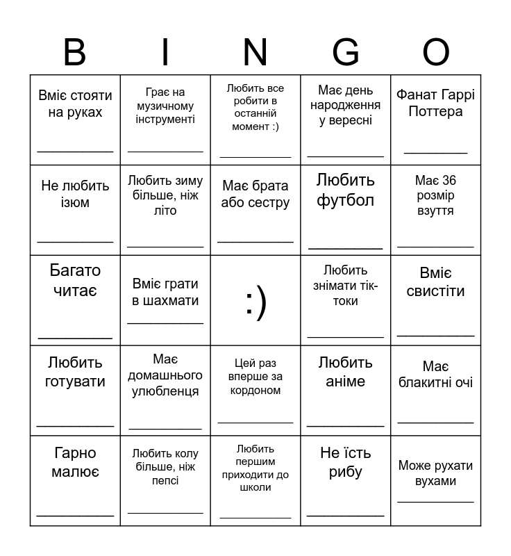 This bingo card has a free space and 24 words: Має домашнього улюбленця __________, Любить колу більше, ніж пепсі ____________, Має брата або сестру __________, Гарно малює _________, Фанат Гаррі Поттера ________, Вміє стояти на руках __________, Не любить ізюм __________, Грає на музичному інструменті ____________, Любить знімати тік-токи ___________, Цей раз вперше за кордоном ____________, Любить футбол ________, Багато читає ________, Любить аніме _________, Має блакитні очі __________, Любить зиму більше, ніж літо ___________, Не їсть рибу _________, Вміє свистіти _________, Любить все робити в останній момент :) ____________, Має 36 розмір взуття ___________, Вміє грати в шахмати __________, Може рухати вухами ___________, Любить готувати _________, Має день народження у вересні ___________ and Любить першим приходити до школи ____________.